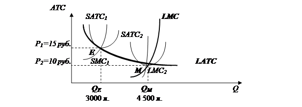 Из рисунка 39 видно, что минимум LATC, точка М, в которой LMC пересекает LATC, расположена правее точки Е, которой соответствует максимизирующий прибыль выпуск долгосрочного периода QE. Эффективность применяемых в производстве ресурсов достигается тогда, когда средние издержки в долгосрочном периоде минимальны LATCmin. Эта эффективность будет достигнута при выпуске периода QM , соответствующем минимуму долгосрочных средних издержек LATCmin (точка М). Но максимизирующий прибыль выпуск монопольно-конкурентной фирмы составит лишь QE, что много меньше QM. Разность между реально выпускаемом количеством товара QE, соответствующим долгосрочным издержкам (LATС) и количеством товара QM, выпускаемым в долгосрочном периоде при LATCmin, называется избыточной мощностью.