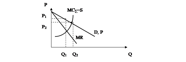Если бы фирмы функционировали в условиях совершенной конкуренции, то цена установилась бы на уровне P1, а объем выпуска составил бы Q1. Но фирмы путем тайного сговора, объединяются в картель. Поэтому кривая спроса Dстановится кривой спроса фирмы-монополиста.