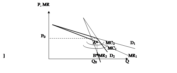 Если кривая предельных издержек MC1, то максимизирующий прибыль выпуск при цене Р0 составит Q0 единиц. Увеличение затрат смещает кривую предельных издержек вверх с MC1 до MC2. Но если предельные издержки MC2 пересекают MR на участке ниже точки A, то фирма не изменяет ни цену, ни выпуск. Таким образом объясняется твердость цен на олигополистическом рынке. То есть модель изогнутой (ломаной) кривой спроса дает ответ на вопрос, почему фирмы в условиях олигополии стремятся поддерживать стабильные цены, перенося конкурентную борьбу в неценовую область.