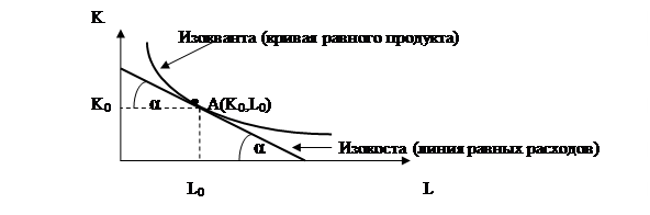 В точке оптимальных количеств используемых ресурсов А(К0,L0) изокванта обязательно касается изокосты. Наклоны изокванты и изокосты в точке их касания совпадают. Поэтому предельная норма замены первого ресурса вторым в точке А(К0,L0) (равная отношению предельной производительности этих ресурсов) должна равняться отношению их цен: