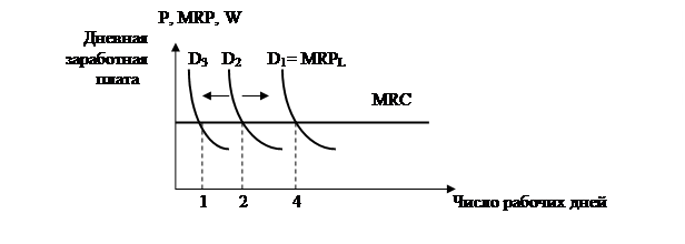В частности, показано, что если увеличение спроса на трудовые услуги произойдет из-за увеличения цены продукта или из-за увеличения предельного продукта труда, то любой из этих факторов увеличит MRPL при любом данном уровне использования труда и сместит кривую спроса на труд от D1 до D2. И наоборот, понижение цены продукции или понижение предельного продукта труда сократит спрос на труд с D1 до D3.