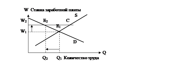 Если предприниматели согласятся платить ставку заработной платы W2, то равновесие установится в точке E2. данное равновесие предполагает ставку заработной платы W2 и уровень занятости Q2. Очевидно, что отдельные предприниматели сократят спрос на труд, так как для них рост заработной платы предполагает рост издержек выпускаемой продукции. В результате мы имеем уменьшение числа занятых в отрасли, что приводит к потерям от неэффективного использования труда в размере площади треугольника E1E2C.