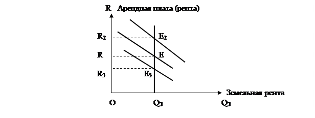 Рисунок 11.2. показывает, что при ставке арендной платы R спрос на землю равен QЗ, собственник земли извлекает ренту OREQЗ. Повышение (понижение) спроса на продукты сельского хозяйства вызывает рост (снижение) спроса на землю при любой данной арендной ставке. Поскольку предложение земли фиксировано, то с целью установления равенства спроса и предложения необходимо, чтобы арендная плата возросла до R2 или понизилась до R1. Тогда и рента или возрастет до OR2E2QЗ, или понизится до OR1E1QЗ.