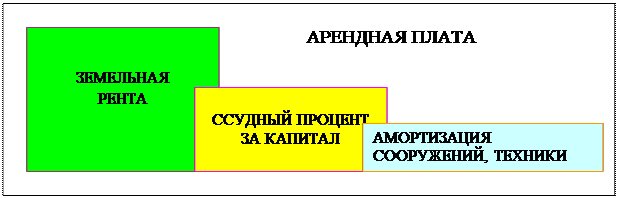 Земельная рента выплачивается в виде арендной платы. Однако рента и арендная плата различаются тем, что арендная плата может включать в себя и другие платежи: ссудный процент за капитал, амортизационные отчисления и т.п. (рис. 11.3). Рисунок показывает, что земельная рента, вместе с тем, является основной частью арендной платы.