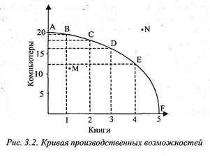 при данном количестве ресурсов и при данной технологии производства. Точка «М», находящаяся внутри кривой производственных возможностей, показывает, что распределение ресурсов является неэффективным.