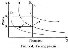 продукт от земельного участка уменьшается по мере увеличения его площади и фиксации инвестированной рабочей силы и физического капитала в результате действия закона убывающей доходности. Поэтому кривая спроса имеет нисходящий Характер (рис. 9.4).