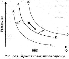 Модель совокупного спроса представлена в виде кривой, которая характеризует зависимость между объемом покупаемого реального ВНП и уровнем цен (рис. 14.1).