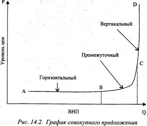 Кривая совокупного предложения состоит из трех отрезкой 1) горизонтального (АВ). ВНП может изменяться (увеличи