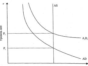 На вертикальном отрезке сдвиг кривой совокупного спроса сопровождается только ростом цен (инфляцией спроса), реальный ВНП не изменяется. Если совокупный спрос увеличится, цены возрастут, а реальный объем производства останется неизменным.