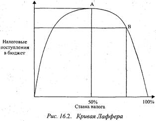Графически этот эффект отображен на кривой Лаффера, показывающей зависимость поступаемых в бюджет сумм на логов от ставки налога (рис. 16.2).