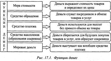 Сущность денег раскрывается в их функциях. Ученые-экономисты считают, что можно выделить пять функций денег (рис. 17.1).
