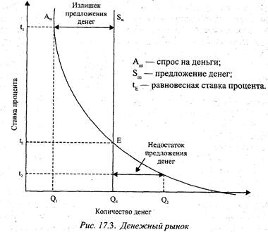 Основные участники денежного рынка — фирмы, Правительство, Центральный и коммерческие банки. Объект купли-продажи — деньги, предоставляемые во временное пользование. Как на любом рынке, равновесие имеет место в точке пересечения кривых спроса и предложения (рис. 17.3).