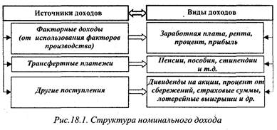 Номинальные доходы — общее количество денег, которое получено за определенный период времени; характеризуют уровень денежных доходов независимо от налогообложения и изменения цен (рис. 18.1).