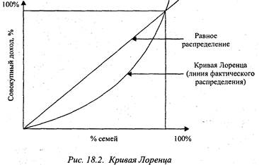 Для количественной оценки дифференциации доходов применяют различные показатели. Степень неравенства доходов отржает кривая Лоренца (рис. 18.2).