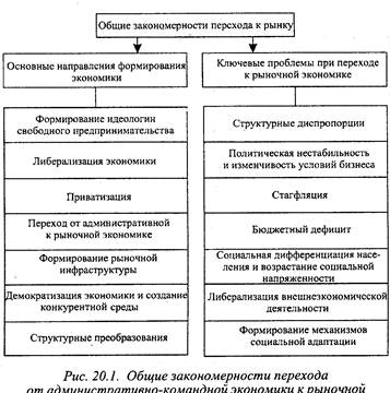 Переход от административно-командной к рыночной экономической системе в разных странах имеет общие закономерности (тенденции). Этот процесс включает либерализацию экономики, глубокие изменения в отношениях собственности, структурные преобразования, а также финансовую стабилизацию (рис. 20.1).