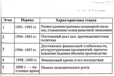 Опыт стран по трансформации экономических систем выделяет следующие этапы переходной экономики: 1) этап 1 (1991 г.) — создание политических и институциональных предпосылок;