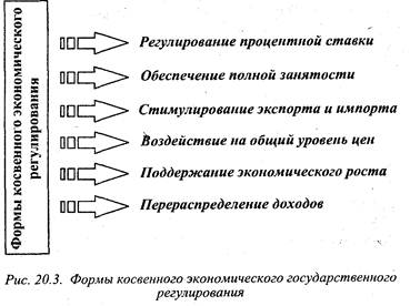 4) косвенное экономическое регулирование (использует в основном рычаги кредитно-денежной, налоговой, амортизационной, валютной, внешнеэкономической политики и др.) (рис. 20.3).