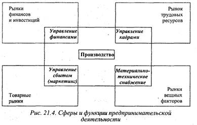 По функциональным признакам предпринимательства функции подразделяются на управление финансами и производством, кадрами, материальными потоками и сбытом (рис. 21.4).