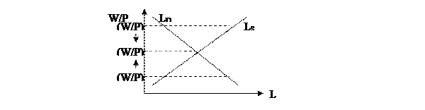 Отклонение заработной платы от равновесного уровня вверх или вниз выводит рынок труда из состояния равновесия. Предположим, что реальная заработная плата возросла до уровня (W/P)1. В том случае предложение труда превышает спрос на труд. Появление безработных воздействуют на уровень заработной платы в сторону ее снижения, что увеличивает занятость, и сокращает разрыв между спросом и предложением труда. Этот процесс продолжается до тех пор, пока не будет достигнуто состояние равновесия при полной занятости. Если же реальная заработная плата находится на уровне (W/P)2, то под воздействием рыночного механизма развитие процесса идет в противоположном направлении. При реальной заработной плате (W/P)2, как мы видели, создается избыток спроса над предложением труда. Многие из предпринимателей, которые не смогли удовлетворить свой спрос на рабочую силу, готовы предложить трудящимся более высокую, чем существующая на рынке, реальную заработную плату. Естественно, рабочие предпочитают получать более высокую заработную плату, так что предприниматели, не желающие потерять рабочих, вынуждены повышать ее. При повышении реальной заработной платы уменьшается разрыв между спросом и предложением труда, и процесс сближения продолжается до тех пор, пока не остается ни одного предпринимателя, который был бы согласен платить рабочим реальную заработную плату более высокую, чем существующая на рынке. Таким образом, и в этом случае происходит движение рынка к состоянию полной занятости.