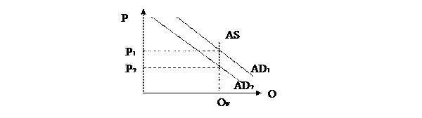 С учетом постоянной полной занятости кривая совокупного предложения AS на товарном рынке также представлена вертикальной линией (рис. 3.7 (б)). При любом уровне цен Р выпуск товаров происходит на уровне естественного выпуска FE. Падение совокупного спроса (например, под действием какого-либо неценового фактора) графически отражается сдвигом кривой AD1 в положение AD2. Это приведет к превышению совокупного предложения над совокупным спросом при уровне цен P1 и вызовет падение цен. Дефляция будет способствовать росту количества товаров, на которые предъявляется спрос, до тех пор, пока новый уровень цен Р2 не установится в соответствии с пересечением кривых AD2 и AS. При этом в экономике достигается полная занятость.