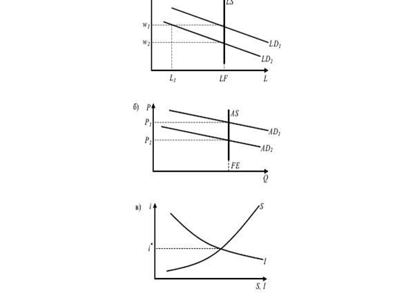 Рассмотрим графическую интерпретацию макроэкономического равновесия (рис. 3.7). Поскольку экономика постоянно функционирует в режиме полной занятости, то кривая совокупного предложения труда LS вертикальна на уровне LF – величины рабочей силы (рис. 3.7 (а)).