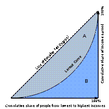 Прямая линия (ОА) называется линией абсолютного равенства распределения доходов. Она отражает ситуацию, когда 20% людей принадлежат 20% доходов, 40% людей - 40% доходов и т.д. Кривая (ОВ) показывает долевое распределение доходов по группам семей в действительности.