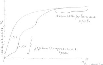 НЬ связывает 4 молекулы О2, на 1 тетрамер (по одной молекуле на гем в каждой субъединице). Кривая насыщения носит сигмоидный характер. Т.о. способность НЬ связывать О2 зависит от того содержатся ли в данном тетрамере другие молекулы О2,. Как видно из изотермы адсорбции связывание первой молекулы О2, протекает медленно, другой - с большей скоростью и т.д. Такой характер кинетики объясняется так называемым кооперативным связыванием, благодаря которому НЪ легко насыщается О2 в легких (при Ро2 = 100мм рт.ст.) и очень легко отдает О2, в периферических тканях (Р50 ~20мм рт.ст.). Для характеристики кинетики действия НЬ введён показатель P50 (значение РО2, при котором происходит 50%-ное насыщение, у теплокровных Р50 может значительно варьировать, однако оно всегда выше значения \ в периферических тканях). Оксигенирование НЬ сопровождается значительными изменениями конформации молекул: