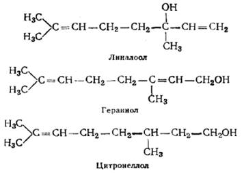 Наиболее важными и распространенными представителями кислородных производных алифатических терпенов являются линалоол, гераниол и цитронеллол. Это спирты. Их структура показана ниже: