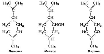 Широко распространены в растениях также кислородные производные моноциклических терпенов. Среди них можно отметить вторичный спирт ‑ ментол, составляющий главную часть (до 70%) эфирного масла перечной мяты, и циклический кетон ‑ карвон, содержащийся в эфирных маслах тмина и укропа: