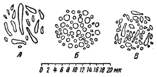 Рисунок 2 — Форма и величина каучуковых глобул латексов: А — тау-сагыз; Б — кок-сагыз; В — гевея