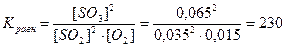 Ответ: Кравн.= 230, Сисх.(SO2) = 0,1моль/л, Сисх.(О2) = 0,0474 моль/л.