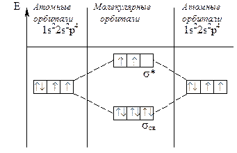 3. Из двух образовавшихся молекулярных орбиталей, одна обладает более низкой энергией, чем исходная, это связывающая молекулярная орбиталь, другая обладает более высокой энергией чем исходная, это разрыхляющая молекулярная орбиталь.