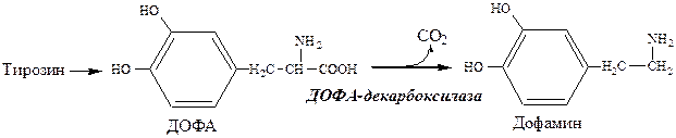 Дофамин образуется (фен → тир → ДОФА → дофамин) в мозге и мозговом веществе надпочечников.