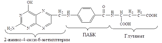 Активная форма фолиевой кислоты – ТГФК. Она образуется в печени при восстановлении фолиевой кислоты с участием фолатредуктазы и дигидрофолатредуктазы, коферментом которых служит НАДФН2.
