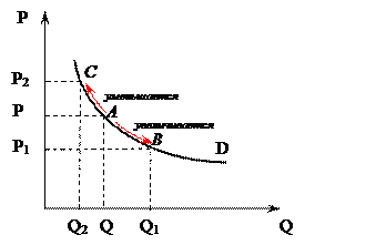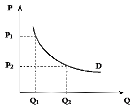 Изобразим эту зависимость между ценой и величиной спроса графически. Если на абсциссе обозначить количество товара Q, покупаемого на рынке, а на ординате – движение цены Р, то получится следующий результат: