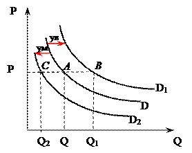 Например, увеличение денежных доходов потребителя (при отсутствии инфляции) означает, что потребитель при постоянной цене Р увеличит потребление до Q1. Кривая спроса сдвинется вправо из положения D в положение D1. Напротив, уменьшения дохода приведет к смещению кривой спроса влево в положение D2, это приведет к уменьшению объема спроса до Q2 при постоянной цене Р.