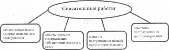 Спасение людей является составной частью процесса ликвидации ЧС, представляющего собой взаимосвязанный комплекс работ, которые по характеру делятся на три специфические группы: