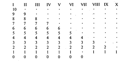 В шкале потребностей в вертикальных рядах, отмеченных римскими цифрами, обозначены различные виды потребностей, начиная с наиболее важной. Цифры в пределах каждого вертикального ряда показывают уменьшение данной потребности по мере ее насыщения. Так, если по степени важности для человека мы поставим на первое место воду, то ясно, что первый литр воды для индивидуума самый полезный: человек использует его для питья и оценивает его наивысшим баллом — 10. Следующий литр воды оценивается ниже — 9 баллами и т.д. Тогда вторую по важности потребность, обозначенную римской цифрой II, например хлеб, оценить наивысшим баллом мы не можем, так как он отдан воде. Значит, наивысший балл для первой, самой важной по полезности для человека порции хлеба, будет 9, для следующей порции — 8 и т.д.