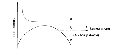 Это положение Джевонс иллюстрирует с помощью графика (рис. 2). Верхняя часть вертикальной оси — полезность для Робинзона очищенной воды, нижняя — тяжесть труда. На горизонтальной оси обозначено время для производства какого-либо полезного продукта (в нашем случае — чистой воды). Кривая в верхней части графика показывает динамику предельной полезности чистой воды. Эта полезность особенно высока сначала, так как наиболее важна очистка первого литра воды (эта вода идет для питья), важна и очистка нескольких последующих литров. Кривая в нижней части графика показывает, как изменяется предельная тяжесть труда. Чем ниже расположена точка на этой кривой, тем, стало быть, неприятнее труд. На первых порах труд может доставлять удовольствие, но потом, по мере накопления усталости, кривая идет резко вниз. В какой-то момент расстояние от верхней кривой до горизонтальной оси (величина предельной полезности дополнительного продукта — отрезок bА) будет равно расстоянию от горизонтальной оси до нижней кривой (предельная тягость дополнительного труда — отрезок Ас). На графике это обозначено точкой A. Если предположить, что 1 литр воды Робинзон очищает за полчаса, то точка А соответствует 4 часам работы, когда очищено 8 литров воды. Дальнейшее продолжение работы неэффективно, достигнута конечная эквивалентность между трудом и полезностью.