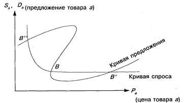 Графически спрос и предложение можно представить так, как на рис. 3. Точки В" и В' описывают устойчивое равновесие (система при выходе из данных состояний возвращается в эти же состояния), точка В — неустойчивое равновесие (при выходе из этого состояния система приходит в точки В' и В"). Равновесная цена показана на графике как точка пересечения кривых спроса и предложения. Вальрас считает, что максимум эффективности по полезности для каждого участника обмена достигается тогда, когда отношение меновых ценностей товаров равно отношению их предельных полезностей.