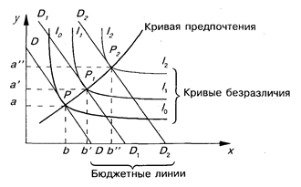 Кривая предпочтения указывает на выбор той структуры потребления, которая, с одной стороны, находится на пересечении кривой безразличия и кривой предпочтения, а с другой — ограничивается уровнем дохода.