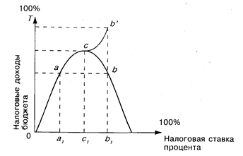 Один из создателей этой теории, Анри Лаффер, иллюстрирует свои идеи с помощью кривой, названной его именем (рис. 11). На графике вправо по горизонтальной оси отложен размер налоговой ставки государства; вверх по вертикальной — размер налоговых доходов государственного бюджета. Вначале, по Лафферу, повышая норму налогообложения, государство увеличивает массу своих доходов, но это имеет место лишь до определенной точки (на графике — точка с). После ее прохождения дальнейшее повышение налогообложения ведет к уменьшению массы налоговых поступлений вследствие резко отрицательного воздействия чрезмерно высоких налогов на экономическую активность частного сектора. Поэтому снижение налоговой ставки, показанное на отрезке кривой Лаффера слева от точки с, вызовет не сокращение (или кратковременное сокращение), а увеличение массы налоговых доходов государства и приведет к сокращению дефицита госбюджета. Точка с соответствует максимальному размеру налоговых поступлений в бюджет государства (это наблюдается при ставке налога примерно в 45%). Точки а и b указывают на одинаковые доходы. В точке b ставка налога равна примерно 60%, но доходы государства соответствуют точке а, где ставка налога равна приблизительно 35%. Отрезок a1b1 на оси ординат соответствует величине налогов, которые бюджет государства недополучил. Это потери и производителей, и потребителей (производство сокращается с точки b1 до точки а1 на оси абсцисс).