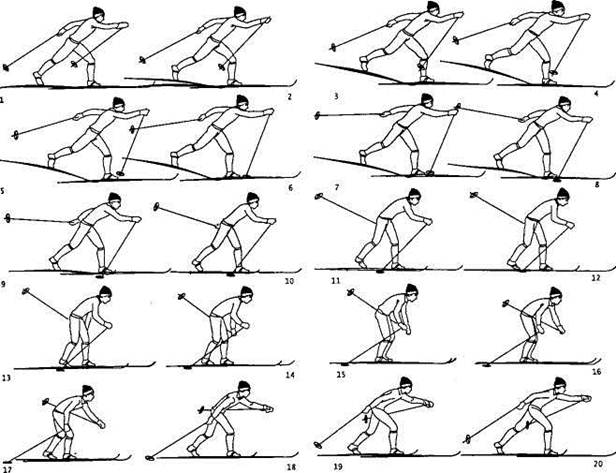 В каждом шаге различают периоды скольжения и стояния лыжи и выделяют пять фаз.