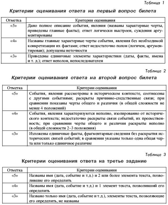 Оценивание ответов экзаменуемых осуществляется в соответствии с требованиями образовательного стандарта, которые конкретизированы для вопросов 1, 2 и 3 (см. п. 7). При этом учитываются объем, сложность каждого из вопросов.