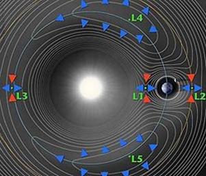 Телескоп JWST будет размещён во второй точке Лагранжа L2 системы Солнце - Земля на расстоянии 1,5 млн. км. от нашей планеты, в постоянной тени Земли, таким образом, что температура его рабочих инструментов будет ниже 50K (-223 °С), (Рис. 5.7). Точки Лагранжа (точки либрации (от лат. libratio - качание, колебание) или L-точки - это такие точки в системе из двух массивных тел, в которых третье тело с пренебрежимо малой массой, на которое не действуют никакие другие силы, кроме гравитационных сил со стороны этих двух массивных тел, может оставаться неподвижным относительно этих тел.