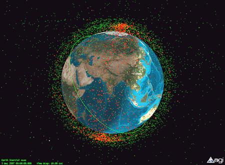 (Зелёные точки - околоземные спутники, зелёная линия - орбита МКС, красные точки - космические обломки с диаметром свыше 10 см. Концентрация красных точек на обоих полюсах - это обломки китайского спутника, сбитого китайцами 11 января 2007 года (примерно 2400 обломков с диаметром свыше 10 см).
