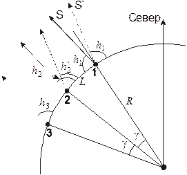Здесь R – радиус Земли. В градусной мере угол g равен 18°. Если бы верхняя кульминация звезды в пункте 1 происходила к северу от зенита (положение S`), то, как видно на рисунке, в пункте 2 она бы произошла также к северу от зенита на угол g ниже: