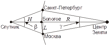 4. Решение. Для решения задачи нам нужно определить высоту спутника над поверхностью Земли H. Это можно легко сделать, считая угол b, под которым со спутника видно расстояние S (Москва – Санкт-Петербург), малым:
