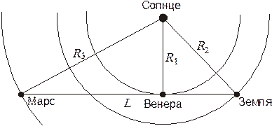 5. Решение. В случае круговых орбит наибольшая элонгация (угловое расстояние от Солнца) внутренней планеты наступает, когда направление на нее из точки наблюдения является касательной линией к ее орбиты. Наибольшая элонгация Венеры по условию задачи восточная для Земли и западная для Марса, следовательно, Венера находится на линии, соединяющей Землю и Марс.