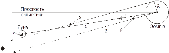 Пусть линия, связывающая центры Земли и Луны, образует угол i с плоскостью эклиптики, а расстояние между Землей и Луной равно L. На рисунке показаны условия покрытия звезды с максимальным удалением от эклиптики b. Это покрытие будет видно из одной точки Земли. Из рисунка видно, что